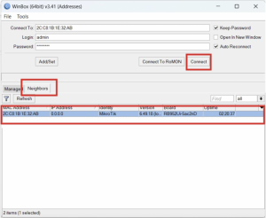 https://mikrotik.com/download - In Winbox, go to the Neighbors tab.