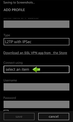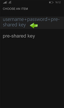 3. – Tap on ‘select an item’ field next to ‘connect using’ and choose ‘Username + password + pre-shared key’.